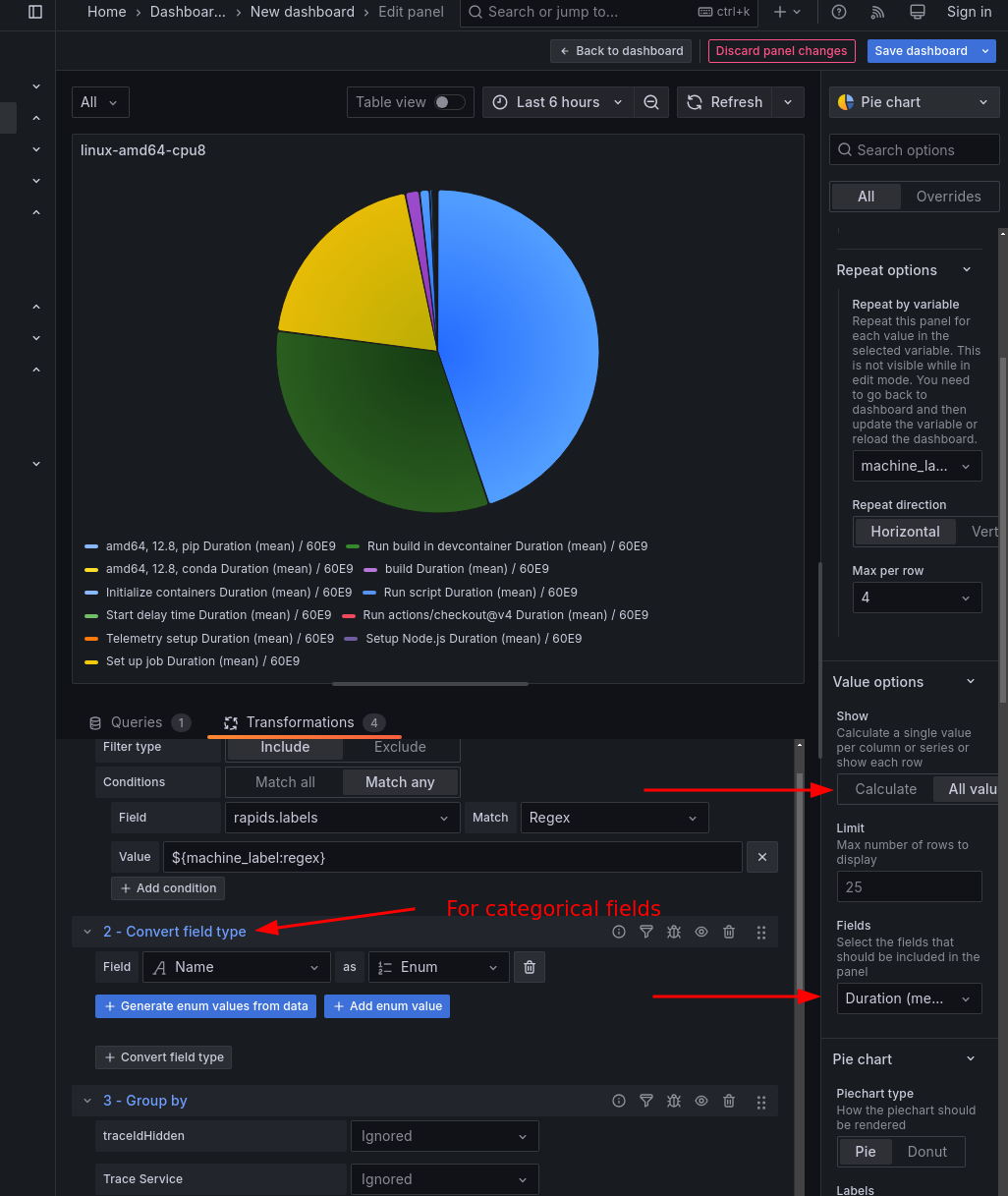 wheel-build-cppby project to compare the average wheel build time for each project. This would be a good bar chart. - You can sum the span time for all usage by machine label to show resource usage. This is particularly useful when combined with filters and dashboard variables to make multiple plots.