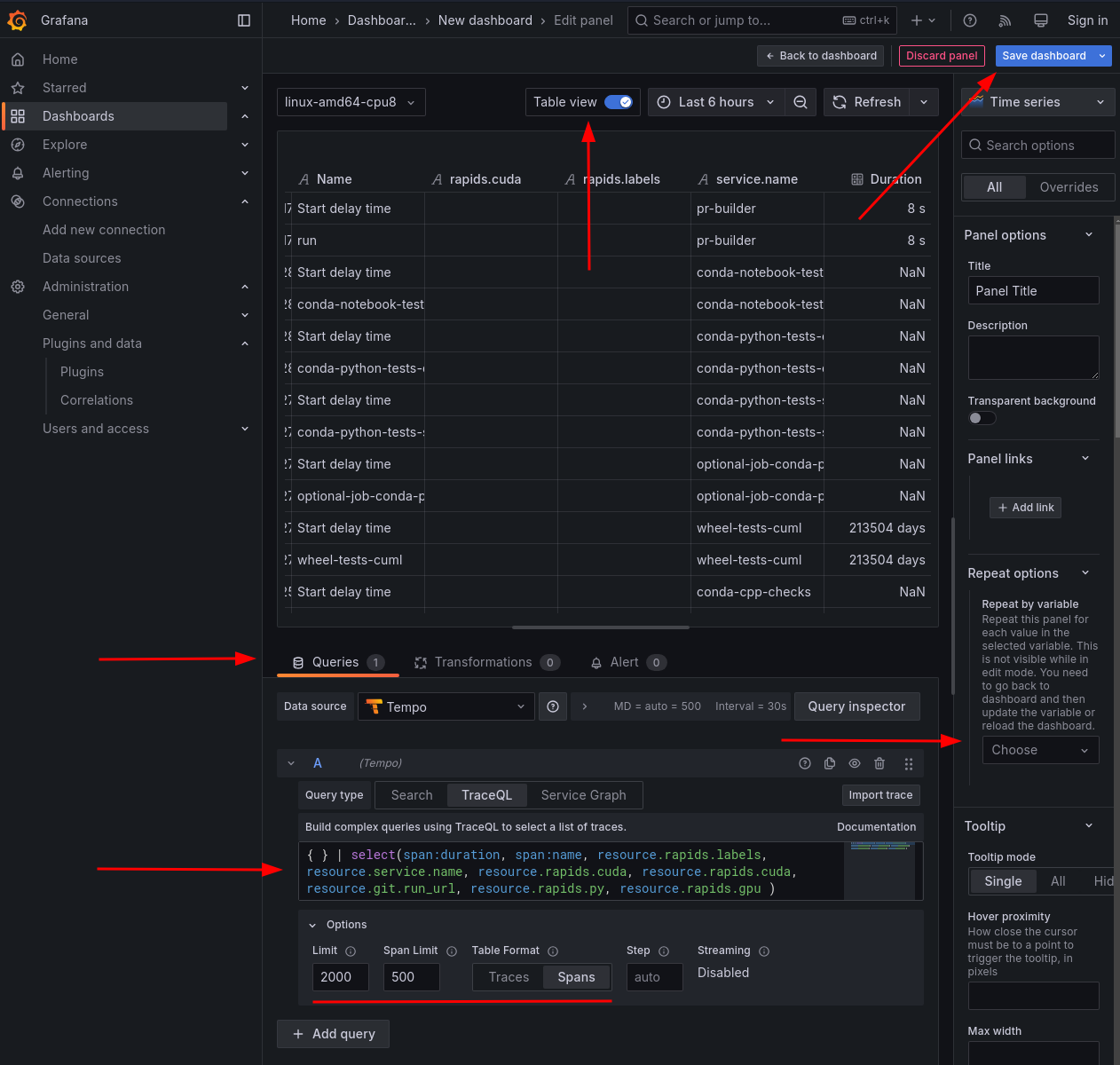 Grafana has something called “dashboard variables,” which serve to select some value for a particular dimension. Using this as the input to the data filters makes it easy to make multiple plots for different values of the variable (e.g. different machine labels or different RAPIDS repos)
